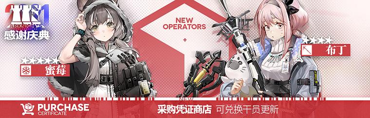 新增说明:新增干员【蜜莓】、【布丁】可通过采购凭证商店兑换获取。暂不加入【公开招募】及任何【标准寻访】