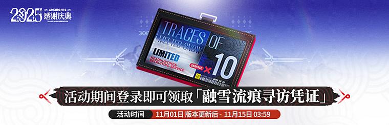 活动说明:玩家在活动期间进行登录即可在活动页面中领取登录奖励:[融雪流痕寻访凭证]*1