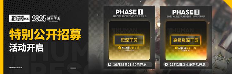 ◆首期活动时间:10月25日 21:30 - 11月01日 03:59,玩家下次在公开招募刷新招募词条必定出现资深干员词条(仅限一次)
