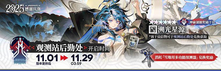 主要奖励:活动干员【★★★★★★:溯光星源】、【喀兰贸易接待室】家具(部分)、模组养成材料、雪地用多功能探测器等